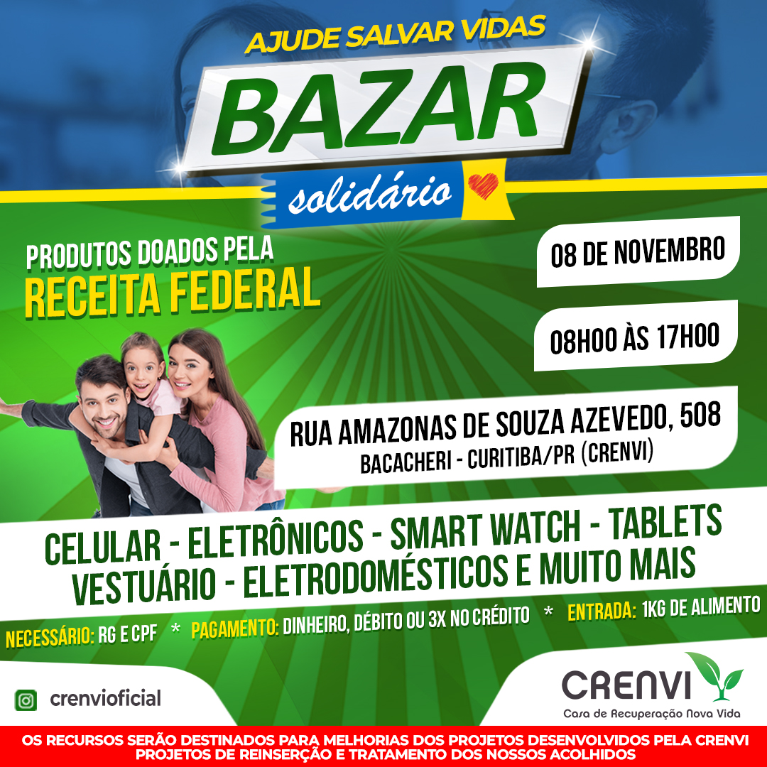 🎯Já pensou em comprar mais barato e ainda fazer o bem? 📢No dia 08/11/2025 (sábado), das 08h às 17h, será realizado o Bazar Beneficente da CRENVI, com produtos apreendidos pela Receita Federal do Brasil e doados especialmente para apoiar as atividades da nossa organização. 🛍️